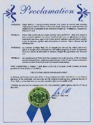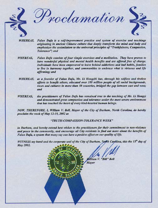 鉴此,我,北卡州杜尔姆市(Durham)的市长威廉.贝尔,特此宣布2002年5月12日至19日为杜尔姆市的
