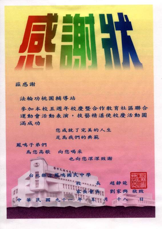 先前因连续两日大雨,部份功友还担心今日仍有大雨,一大早却天清气爽,大大鼓舞了我们。许多功友甚至扶老携幼一同来参加,因此在现场看到了许多身着大法黄衫的小弟子;当10点20分排在第三个社区节目表演的我们列队进场时,只听到许多家长和学校的同学惊呼:有那么多小朋友炼功呢!在负责旁白的功友简明的介绍了法轮功的特点及带给人们身心健康、道德向上的好处后,特别向现场的来宾、同学宣布:每日上午5点半至6点半在该校也有晨炼,欢迎来宾及同学来参加。当功法表演结束时,学校还颁发感谢状,感谢我们参与他们的活动。