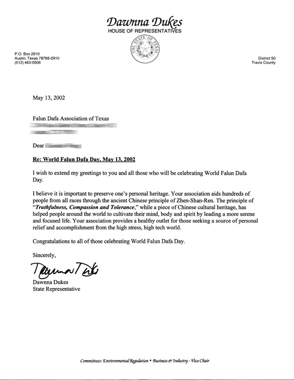 致:德克萨斯州法轮大法学会