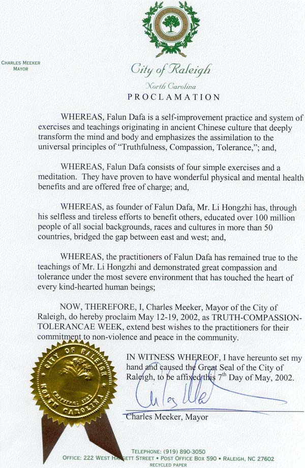 鉴此,我,北卡州瑞利市的市长查尔斯.米科,特此宣布2002年5月12日至19日为瑞利市的 “真善忍周” 并向致力于社区非暴力与和平事业的法轮功学员致以最美好的祝愿。