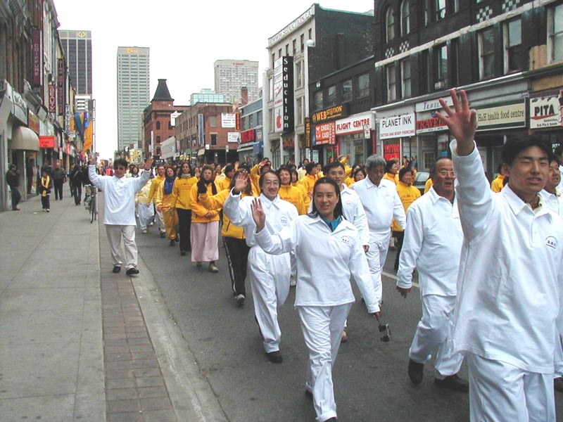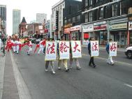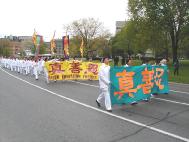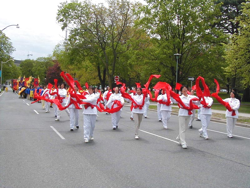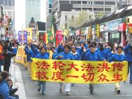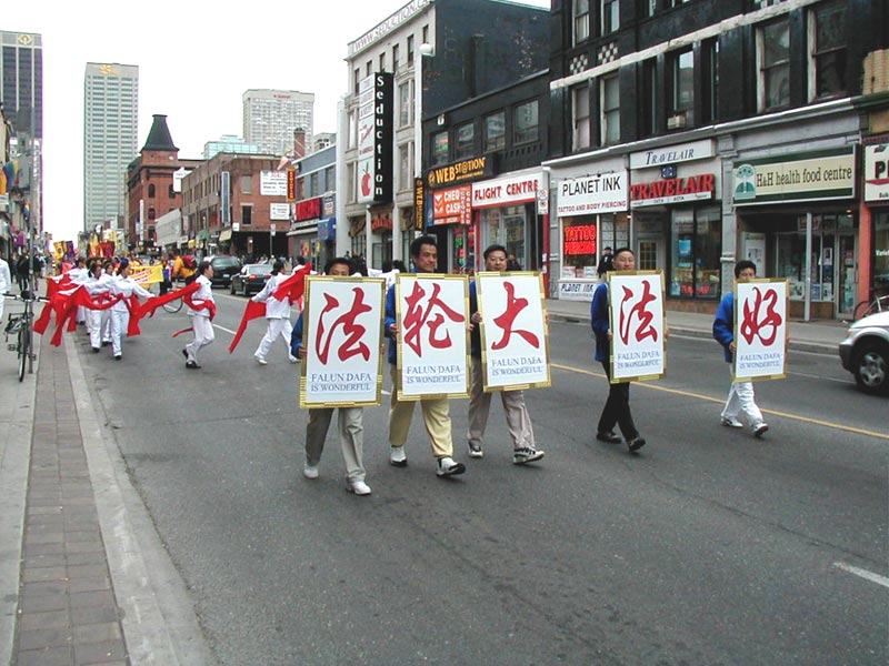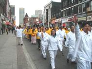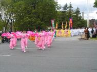 路边,围观的人们兴高采烈的观赏和品评着游行的队伍。在热烈和喧闹声中, “法轮大法好”的美妙音乐、喜悦祥和的法轮功学员的游行队伍为人们带来了惊喜。有白色、蓝色、黄色组成了几个不同的方阵,加拿大国旗,与“法轮大法在加拿大”的横幅遥相辉映。彩车上的仙女和扇子舞、彩带舞得到了观众的喝彩和掌声。色彩缤纷的竖幅法轮旗和真善忍的三角旗组成了小型方阵,显现出庄重与威严。可以看到一些华人看到这样的场面时,先是睁大了眼睛,脸上显出吃惊和受震撼的神色,旋即面容上浮现出明快的笑容。在佛光普照下,人心正在改变着。