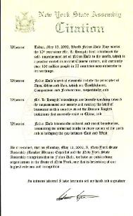 现决定,我,纽约州议会议员艾德里安诺-爱斯帕莱特(Adriano Espaillat)和纽约州议会于2002年5月13日星期一公认,法轮大法给我们纽约州带来了一个杰出的团体、一个值得我们致予最崇高的尊意和褒奖的团体。