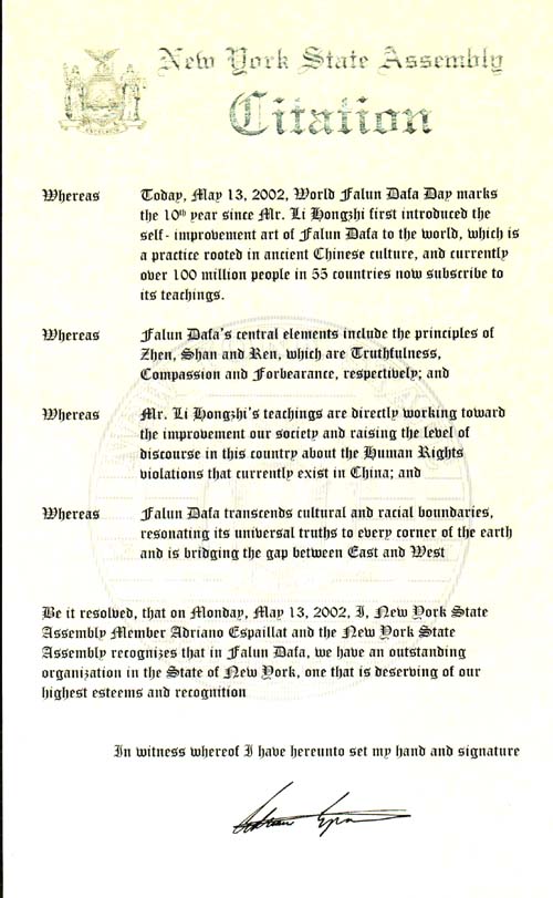现决定,我,纽约州议会议员艾德里安诺-爱斯帕莱特(Adriano Espaillat)和纽约州议会于2002年5月13日星期一公认,法轮大法给我们纽约州带来了一个杰出的团体、一个值得我们致予最崇高的尊意和褒奖的团体。