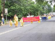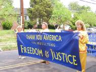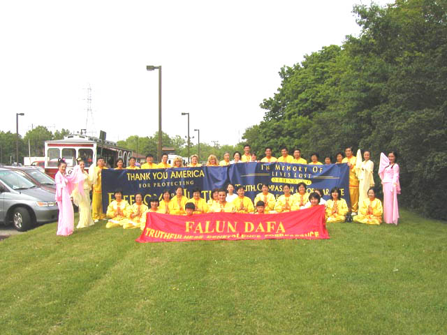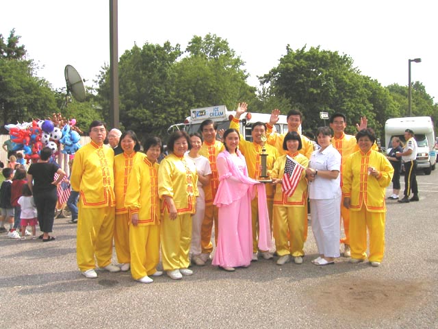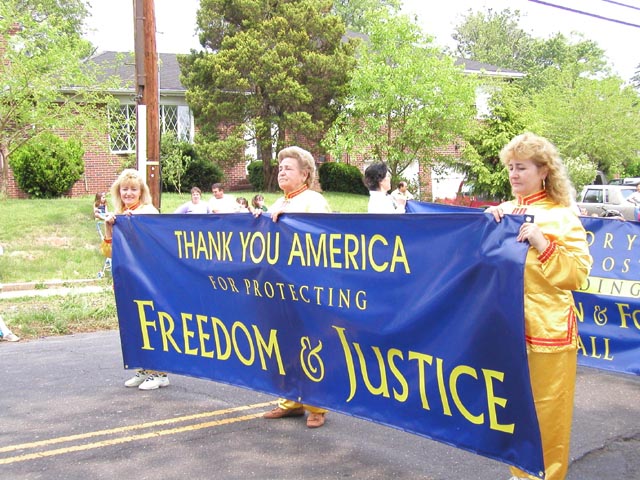 游行中,三名身着金黄色炼功服的中西学员打着“法轮大法 真善忍”横幅走在队伍的前列,接着是四名身着仙女服装的女学员随着“普度”音乐翩翩起舞,三位金发俄裔女学员举着“感谢美国卫护自由与正义”的横幅。然后是近三十名身穿金黄色炼功服的学员,不时为观众表演功法。