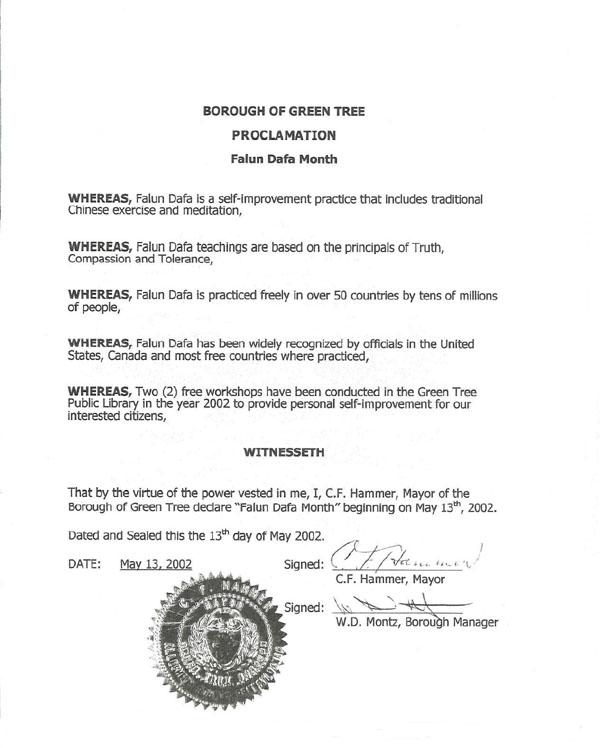 我,绿树市市长C. F. 翰默,以我被赋予的权力,宣布“法轮大法月”于2002年5月13日开始。