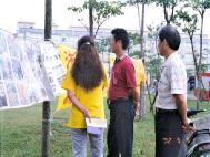 开幕后接下来的节目就是各项竞赛,主办单位青工会鼓励大家多多参与,也邀请法轮功学员参加,还说有奖品可以拿,学员则加以婉谢。因为学员一心想洪法,便开始发起了简介,也在摊位附近作功法展示,来往的人很多,民众都很愿意接简介了解真相。也有不少民众驻足在大型看板前看洪法图片,有一个人甚至在那看了一个多小时看完了所有的展板后才离去。等到后来我们再遇见他时,他说他向他的朋友介绍了法轮功还给了他简介,我们一听连忙又给了他一份,他兴高采烈地走了。看来这个人未得法就已经开始洪法了。
