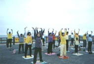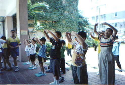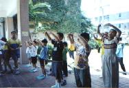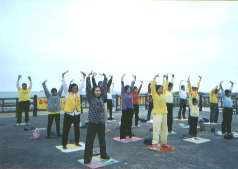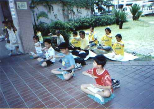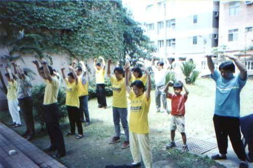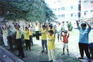 5月4日周六上午十多名学员和几位基隆小弟子班的小学员,参加了本市堵南国小的园游会,虽然没有争取到在大会上表演,但我们在走廊旁的空地反复表演五套功法,弘法效果更好,当日人潮汹涌,川流不息,又有多位小弟子炼功,给该校家长和小朋友留下深刻印象。
