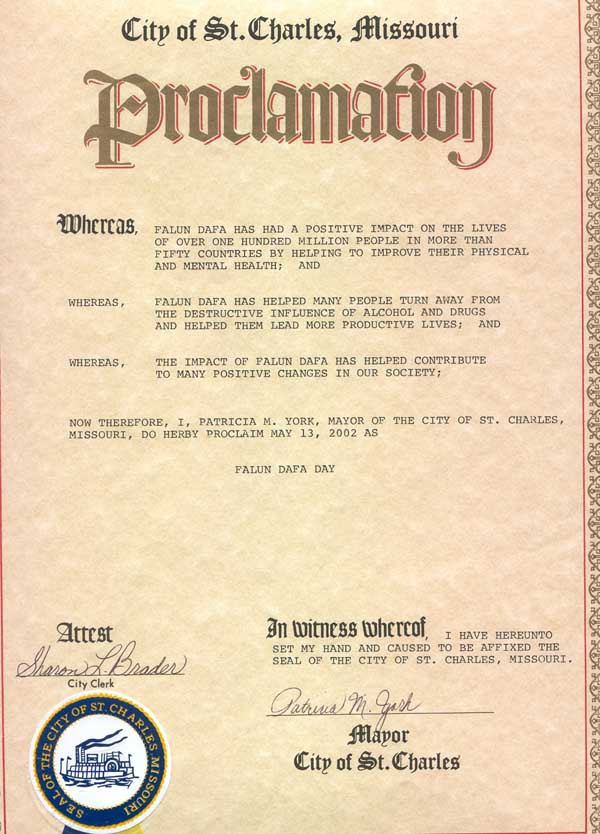 为此,我,帕翠夏.M.约克,密苏里州圣查尔斯市市长,宣布2002年5月13日为圣查尔斯市