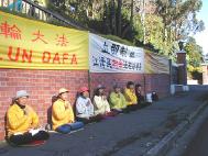 当我们刚挂上横幅,摆好图片,即有一车中国游客到使馆参观。他们下车后先是一惊(不知道在这儿会碰上法轮大法修炼者的和平抗议), 继而被光焰夺目的大法横幅及平静祥和的弟子们所吸引,纷纷取出相机争相拍下这美丽祥和的场面。