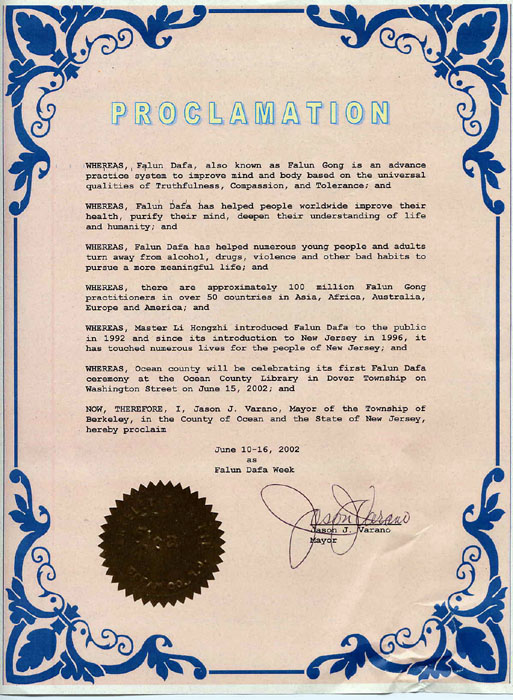 鉴于,大洋县(Ocean County)将于2002年6月15日在位于华盛顿街(Washington Street)的大洋县举办“法轮大法周”的庆祝仪式;