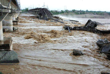报导说,古都西安市附近灞河上一座全长三百六十八公尺的坝桥铁路桥,九日下午被洪水冲垮,陇海铁路拦腰崩塌陷入激流,造成交通中断,有三百多次列车停驶,滞留西安的旅客多达近一万人。