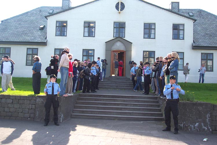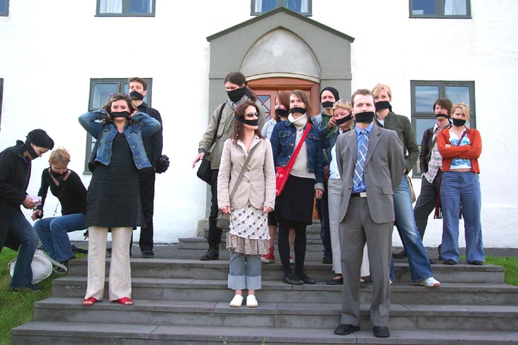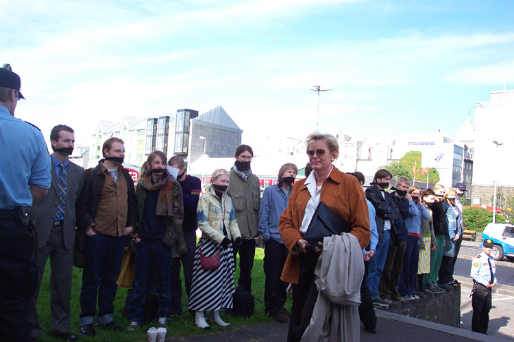 这一消息被一些善良的冰岛人民听说后,在民众、媒体和社会各团体引起强烈反响。以下这些照片是昨天(6月12日)一些善良的冰岛民众在总理办公室外面抗议的情景。他们用布条把嘴封起来,表示对限制言论自由行为的抗议。以这种方式表达他们对扣押法轮功学员这一违反冰岛的民主自由条款的不满,和对中国江泽民违反人权行为的抗议。