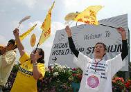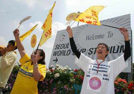美联社图片:2002届世界杯足球赛中国对土耳其开赛前,法轮功学员在汉城世界杯体育馆前抗议(江泽民)在中国迫害法轮功。(美联社记者照片)