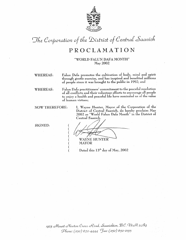 鉴此,我,威恩·亨特(Wayne Hunter),中塞尼赤市市长,特此褒奖2002年5月为中塞尼赤市“世界法轮大法月”。