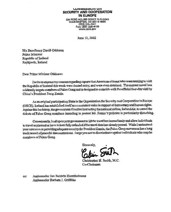 针对有关美国公民在本周欲前往冰岛旅行时被拒绝入境,甚至遭到扣留的报告,我在此致函给您以表达我的关注。目前的这项禁令任意地将法轮功学员作为对象,是在中国国家主席江XX四天的正式访问期间同时出笼的。