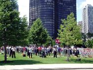 今天芝加哥的上空晴空万里,阳光明媚,来海军码头游玩的人很多。法会及中午炼功期间,许多游人停下脚步,从会议厅外观看法会会场,有的还进入会场问个究竟。学员们借此机会向游人讲真相,游人们纷纷致谢。众生需要大法,法轮大法已渐入世人道。