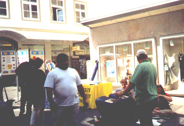 来自维尔茨堡的两位年长的同修给我留下了深刻的印象,一位女士整天都站在街边,而那位男士站在展台附近,他们不知疲倦地给行人分发报纸。我可以感觉到他们的慈悲和他们的善良感染了周围的其他人。我又一次为真、善、忍给我们带来的变化而深深感动。