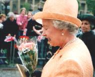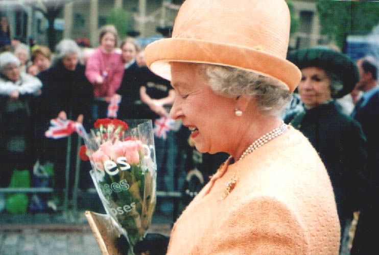 女王在人群欢呼声中进入了市政厅。而另两位同修手上的礼物却没有机会奉送。我们决定等女王离开时再试试。问明警察女王离开时的行走路线后,我们来到广场的另一边。站定后开始发正念。大约差5分到5点,随着人群的欢呼,女王再一次现身广场。这时,我让两岁大的女儿坐在肩头上,她手里拿着一份金纸包的小礼物。另一位功友在旁边,手里拿着另一份真相礼物。还有一位功友就负责照相。当全世界大法弟子齐发正念的时间刚到(英国时间下午5点正),只见女王在王室成员的簇拥下缓缓地向着我们走来,她接过两岁小女儿递给她的礼物时,问:“这是什么”?“这是中国音乐(普度、济世音乐CD)”,我回答道。“中国音乐?”女王重复道,似乎想搞清楚到底是什么。我又加了一句:“是的,这是……”。这时,旁边的功友也不失时机地递上了大法真相,女王也接受了。