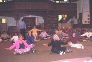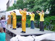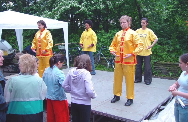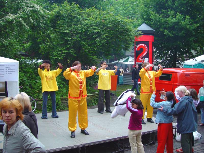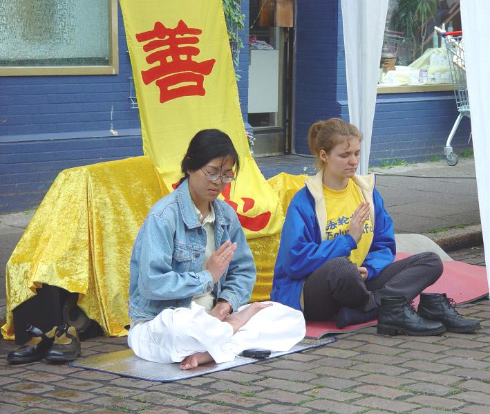 大家动手很快用彩色中英文“法轮大法”、“真善忍”、“法正乾坤”小横幅将舞台进行了装饰,接着便男女分批轮换着上台进行五套功法演示,舒展的炼功动作,伴着英文解说配音的优美炼功音乐,向人们展示着“真、善、忍”的祥和与宁静。人们被功法示范殊胜的场景震撼了,聚在台前驻足观看,争睹法轮大法的美好。中午时分,又来了10余名加拿大弟子。悉尼弟子与加拿大弟子同台进行了功法示范表演,更显世界大法弟子的整体粒子的凝聚力。