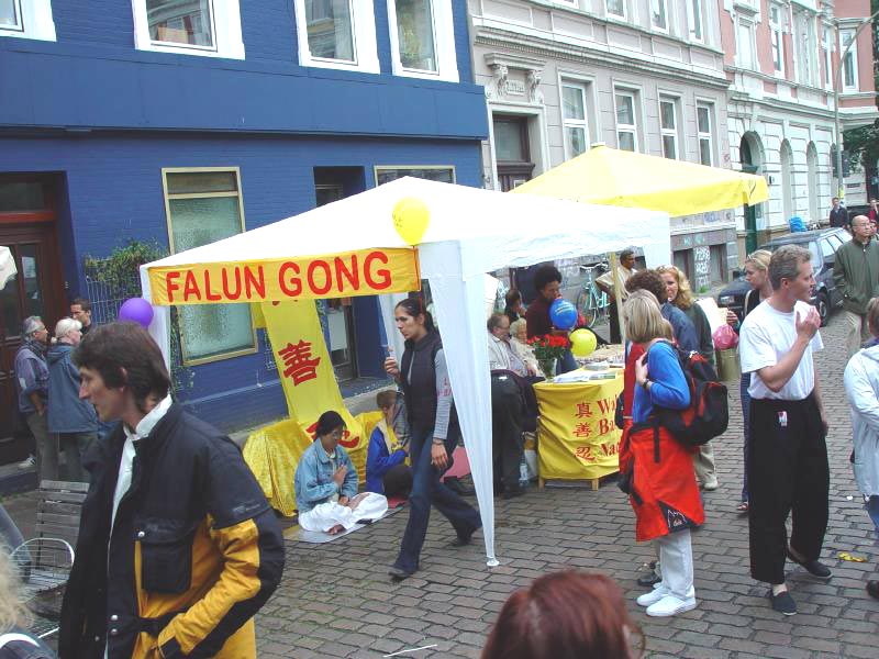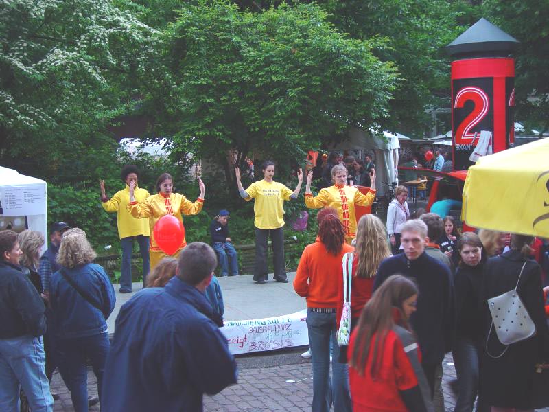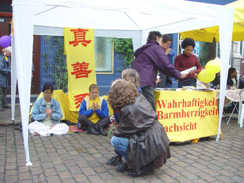 人们乐意接受,有的争相索取大法真相材料,有的兴致浓厚地询问大法信息,或与大法弟子深入交谈。一位老人乐呵呵地说,太好了,我对你们的表演太感兴趣了。一会儿,这位老人余兴未尽地又拿着个相机走过来,要给大法弟子拍照,并将台上炼功的大法弟子背景也全部照了下来。并问道:明天你们还来吗?什么时候来?我还想多看看这样的表演;一位当地小伙子,两天来就是看不够,铁板钉钉地站在那儿观看功法表演,直到次日下午5时,大法弟子教他学功时,才换了个地方。亦有当即想看大法书籍的,有的站在舞台前边看边模仿着大法弟子的动作跟着学起来,有的边走过台前边学做炼功动作。一位当地女士告诉大法弟子,她从广播电台报导得知了当地警方在中国江泽民政府的压力下,对法轮功的态度,但她说,这儿的民众支持法轮大法,祝福法轮大法。一位出生于当地的比利时男士,拉着大法弟子久久攀谈,提出自己对法轮大法的一系列想弄明白的问题,大法弟子逐一给予了解释,并告诉他从明慧网免费下载《转法轮》,这位男士最后一再祝福法轮大法。