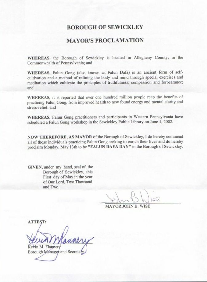 美国新泽西州大洋门(Borough of Ocean Gate)市宣布2002年6月10日至16日为“法轮大法周”。