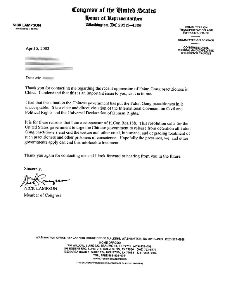 正是基于这个原因,我联合发起了国会第188号决议。这个决议要求美国政府敦促中国政府释放所有被囚禁的法轮功学员,结束对法轮功学员和其他良心犯的酷刑折磨和其它残忍、非人道和侮辱性的虐待。希望我们和其它政府施加的压力能结束这令人无法容忍的虐待。