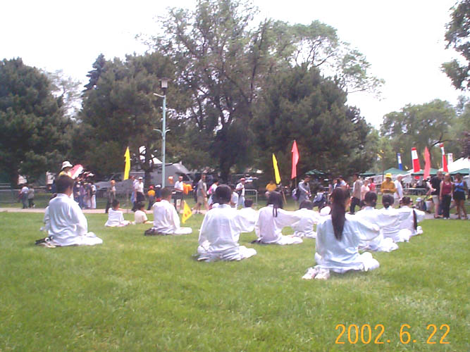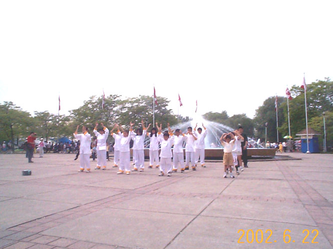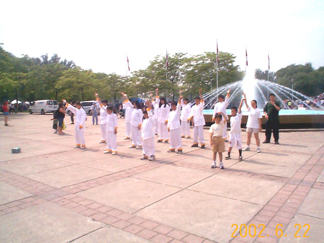 下午一点,龙舟赛开始了,游人们也都上了岛,小弟子们穿上了炼功服,在游人川流不息的公园小道旁开始了功法演示。这时的天空阳光明媚,孩子们的炼功服显得有些厚热,但只见刚才还顽皮天真的孩子们,一个个的表情祥和,动作认真整齐,任凭汗水在脸颊边流淌,却只是一遍又一遍的随着音乐反复炼着功。