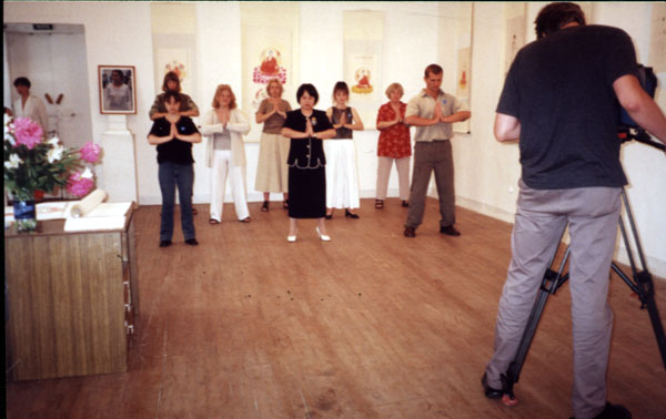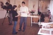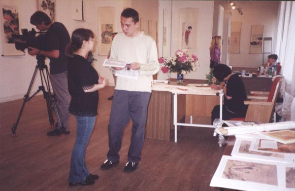 虽然是第二次,还是来了电视台和电台的记者进行采访。圣彼得堡电视台在当晚的新闻节目里对我的个人画展和正法之路图片展进行了报道,播放了很多画和图片的镜头。报道中说到,“中国有很多人炼法轮功”,“画家章翠英因为修炼法轮功而被中国当局关押了8个月”等。一家电台还特意邀请我去他们的录音室做了半个多小时的电台专访直播节目。