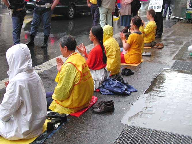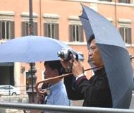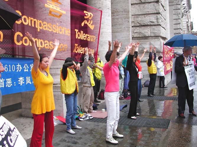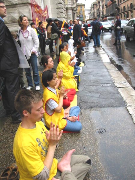 5月24日下午,当意大利内阁副总理非尼(FINI)在总理府CHIGI宫会见李岚清时,大法弟子们在阴雨中,在外面炼功,发正念,并打出“撤销610办公室,法办首恶李岚清”,“真善忍”“法轮大法”“法轮大法好”的横幅。学员在雨中不断地发正念,祥和的炼功场面引起许多路人和执勤警察的关注。因为害怕看到大法弟子,李岚清及其随行人员从侧门进入CHIGI宫,会谈结束后又从侧门,顺逆行车道迅速离开。记者和人权人士调侃地说,世界上最恶的独裁者只配从侧门出入。另外,因为他们在自己的国家肆意违法、使用极权已成为习惯,到意大利还要违反意大利的交通法规。