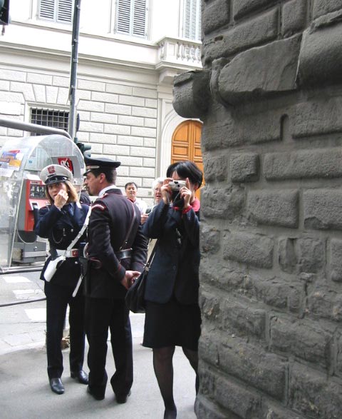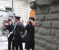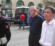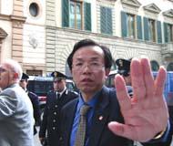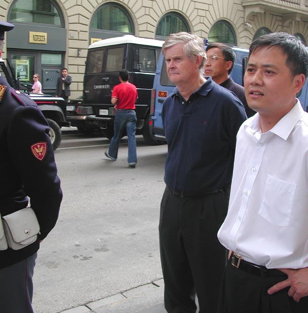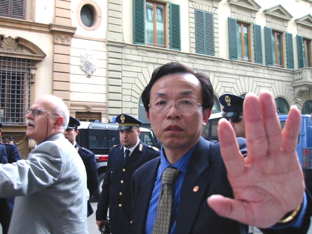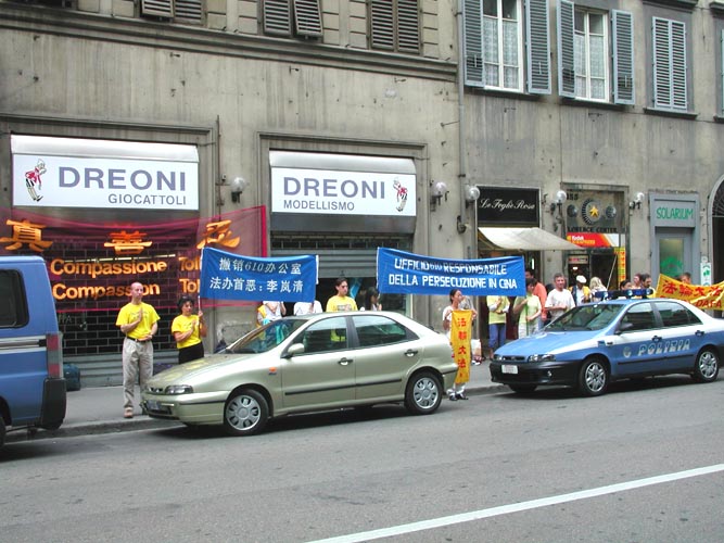 中方保安人员气急败坏地跑来抗议,要求警察驱赶我们离开。这下意大利警察可有机会见识一下中国特务的风度了,只见他们凶相毕露,有的照相,有的不顾体统,大声谩骂。还有一个特务在远处偷偷地在录象。事后,有一位白人女学员说,她真的体验了中国大陆受迫害的大法弟子的处境,她描述说“当我问他们为什么害怕好的东西的时候,有一个中国保安甚至想出手打我,幸好有一位意大利警察在场,并把该人赶走。”学员们理性地有秩序地慢慢退到了一条小街上,开始向这些执行任务的警察洪法,当他们看到英文“见证”上的图片时,都非常震惊,几乎提出同样的问题,“为什么他们要失去理智,镇压这些对任何人都没有伤害的人呢?”学员们从各个不同的侧面给不同的人解释着,最后,所有在场的警察都了解了真相,人们心中升起了正念。