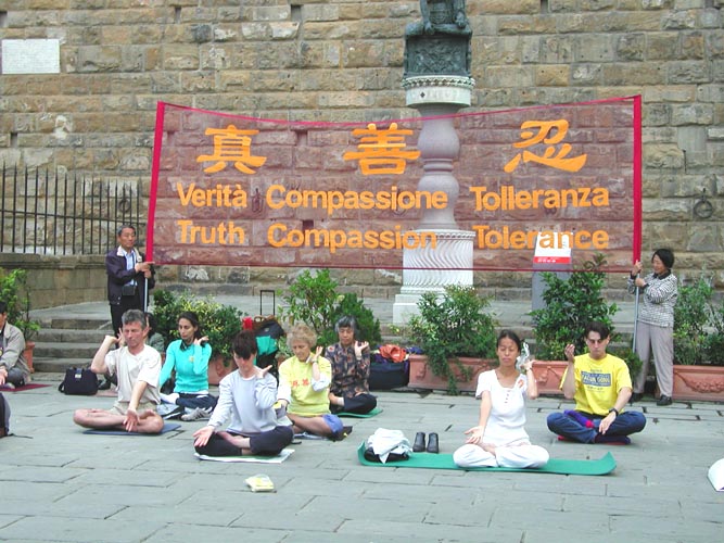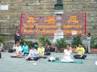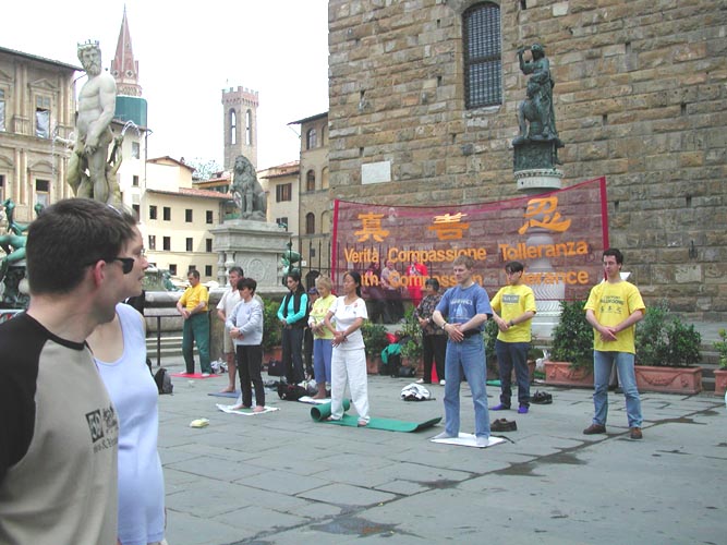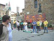 5月25日,大家来到了佛罗伦萨市,据说,李岚清一行要来此地访问,但消息非常不确切。大家还是按照这样的安排准备了,我们相信只要我们的心到位了,师父一定会安排的。根据申请的许可,上午,大家在佛罗伦萨著名的SIGNORIA广场炼功洪法,炼功地点正好在佛罗伦萨市政府VECCIHO宫的前面。因为是世界著名的旅游圣地、艺术之都,游人非常多。大家派发了大量的传单,可惜其他文种的资料没有备好,失去了向更多外国旅游者洪法的机会,但值得安慰的是,他们毕竟看到了学员们的炼功场面和巨大的“真善忍”横幅。