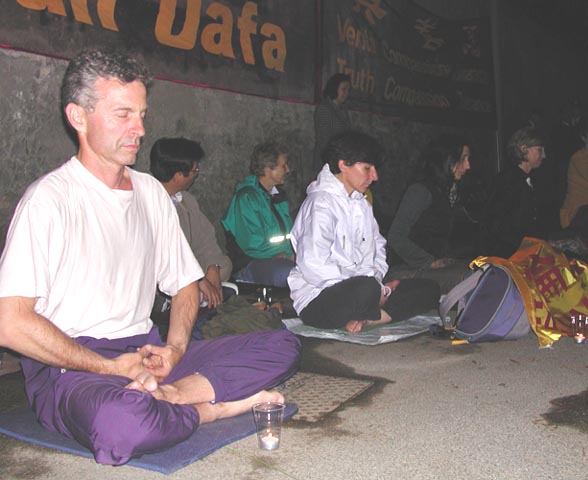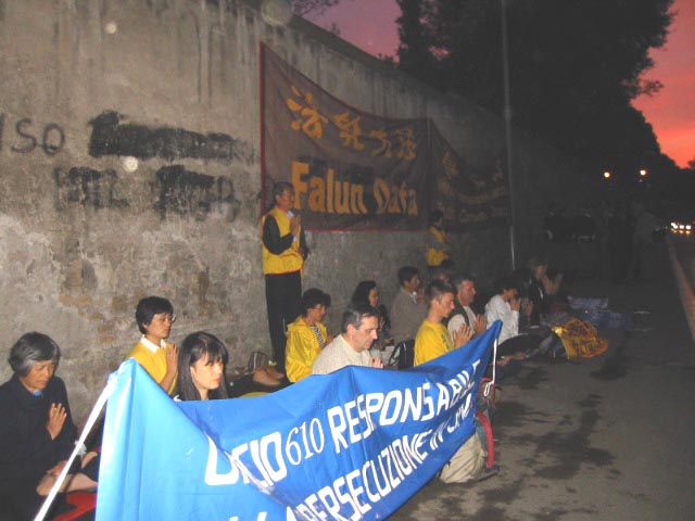 当天晚上,学员们来到副总理非尼提供晚宴的PAMPHILI别墅,按照事先批准的地方,学员们开始了烛光守夜活动。雨停了,学员们不断地静静地发正念铲除邪恶。当车队从别墅处来时,学员们又把横幅高高地举起来,还有许多应邀参加晚宴的贵宾们也看到了。当活动结束时,我们向执勤警察表示感谢时,他们真诚地对我们说“谢谢你们,让我们看到这样美好的场面,祝你们成功!中国的领导人神经有问题,迫害这样的好人。”很高兴又有这么多的人摆好了自己的位置。