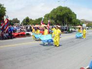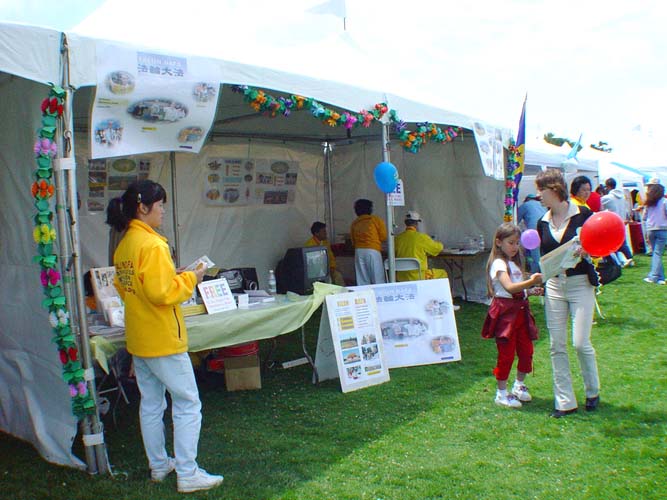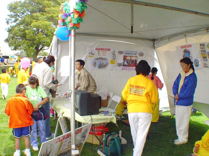 在游行的终点——海洋公园,学员们申请了两个摊位派发真相资料、大法弟子创作的歌曲光盘和表演功法。同时学员们还播放了优美舒缓的大法音乐。所有资料都很快发光了。一个人还拿出他去年接过的传单,高兴地告诉学员他还记着法轮大法。学员们还告诉参观者下星期有免费教功班,许多人都说有兴趣参加。有人还说她已买了法轮功的书籍,她觉得这个功法非常好,并希望全世界的人们都能自由地炼功。学员们还拿出预先买好的糖果请小朋友们吃,因此吸引了不少小孩,但他们最感兴趣的还是精美的大法书签和印有仙女飞天的大法音乐光盘。最后大法音乐光盘被索取一空,有的人没有拿到还显得有点失望。