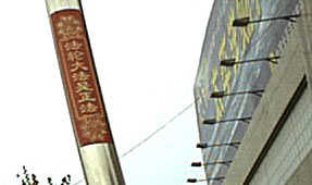 高贴在不锈钢灯柱上的精美大法条幅大陆大法弟子用红漆喷在建筑工地围墙上的特大字“法正人间”