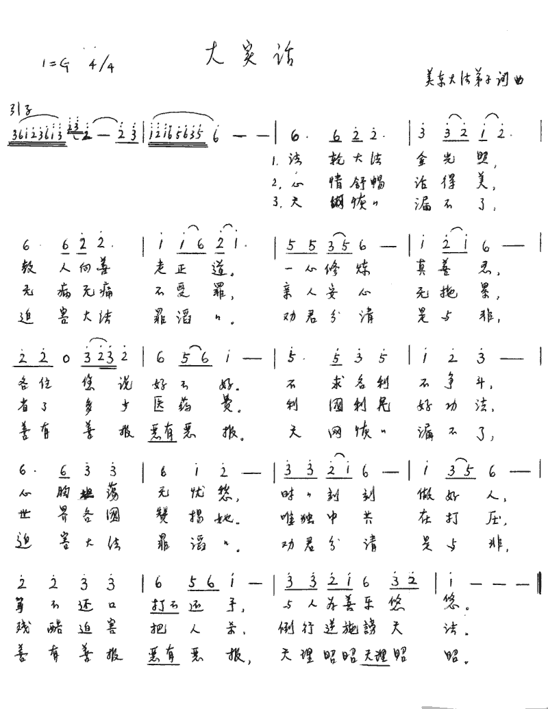 法轮大法金光照,教人向善走正道,一心修炼真善忍,各位您说好不好? 不求名利不争斗,心胸坦荡无忧愁,时时刻刻做好人,骂不还口打不还手,与人为善乐悠悠。 心情舒畅活得美,无病无痛不受罪,亲人安心无拖累,省了多少医药费。 天网恢恢漏不了,迫害大法罪滔滔,劝君分清是与非,善有善报恶有恶报。 |