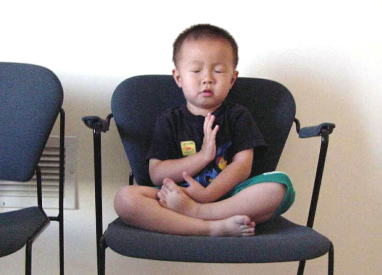 以下是他在大人炼功时自己也在一旁炼功、发正念的照片。
