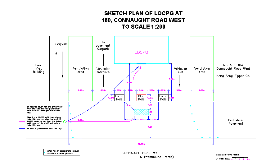 海恩思在辩护中直斥“阻街”指控荒谬绝顶。检方在指控中反复强调,阻街指控成立是因为,假设有中联办员工需要步出正门到肯诺街(Connaught RD)对面吃饭的话,从理论上讲,法轮功学员请愿的位置因为正对旗杆和大门而挡住了这些员工的最短直线距离。而海恩思根据调查指出,穿越肯诺街是违法的,该街两侧不许计程车停靠,所有的员工外出吃午饭都是走左右两侧大门。(附地图)