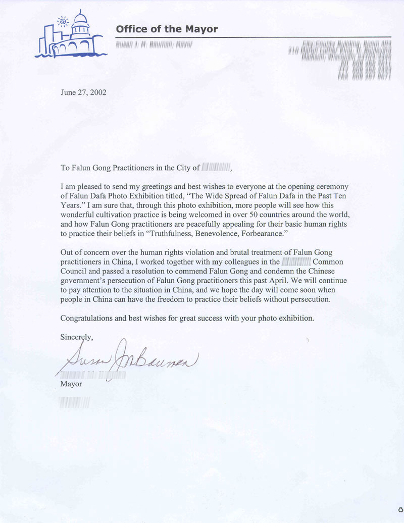 由于我们十分关注法轮功学员在中国遭受的人权迫害和残酷虐待,我和迈迪森市议会的同事们于今年四月通过了一项决议,褒奖法轮功,谴责中国政府对法轮功学员的迫害。我们将继续关注在中国的状况,我们希望中国人民拥有信仰自由的那一日早日到来。