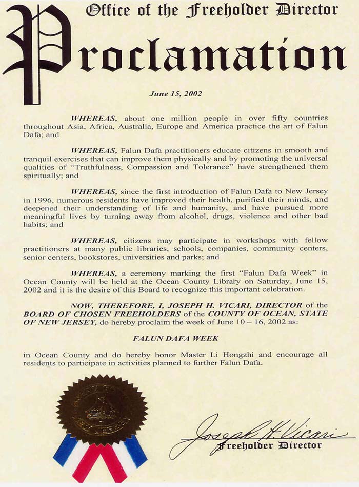 鉴于,自法轮大法从1996年传入新泽西州以来,帮助无数居民戒除了烟酒毒品、暴力以及其它不良习惯,从而使他们改善了身体健康,净化了思想,加深了人们对生命与人生的理解,转而追求更有意义的生活;并且