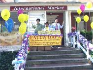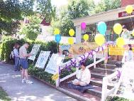 首先是展位的问题。我们参展的决心始终不变,但偏偏忙中疏忽,错过了去年十一月底以前摊位预约申请的期限,今年一月份紧急提出申请时,遭到婉拒。换言之,我们今年本来是没有展出场地的。我们接洽一位新学员,请求提供他们私人开设的超市店面阳台作为展示场,夫妻俩很爽快地答应出借。他们的店面是一幢架高的木造房屋,拾阶而上,凉台正好可供舒展,地点也适中,但接近两条道路的交会口,以往主办单位搭建的篷架总延伸到路口,依此情势,必将我们好不容易借来的场地,阻挡于后,逐出众人视线之外,我们持续发正念,请求师父作最好的安排,结果今年的大白帐篷搭在我们位置左前方煞住,留下右侧一大块空地,不但给了上下活动更宽阔的空间,大法舞台的居高临下,也成为倍受瞩目的焦点,尤其当炼功音乐缓缓流泻而出,我们在台上轮番展演五套功法,往往立刻吸引来往人群的驻足围观,或者探询相关问题,索阅资料;或者兴味十足,当场跟着学炼。