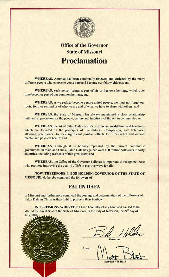 鉴此,我,密苏里州州长,在这里奖励密苏里州法轮大法学员,及在中国为捍卫他们的信仰而努力的法轮大法学员的勇气和决心。