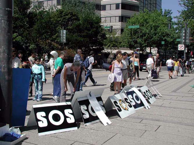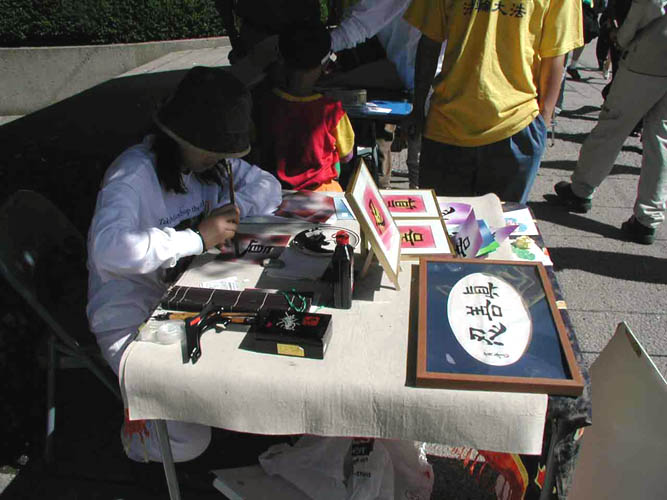 广场上台阶高处挂著大横幅“WE END PERSECUTION(让我们共同制止镇压)”、中英文“真善忍”及至今已被迫害致死的法轮功学员人数;广场一侧摆着法轮大法的展板,在醒目位置摆放着温哥华一位学员被关押并迫害致死的亲人的照片及家书;广场一角还有美术家法轮功学员在为路过的市民书写隶书“真善忍”;一个摊位在折叠纸莲花,配上自行设计的美术卡,一起送给有缘人。整个广场显得庄重而又祥和。