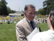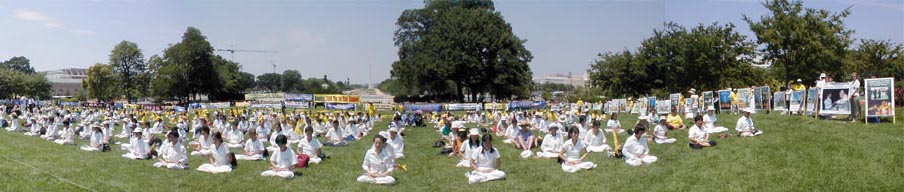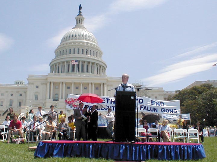 正午时分,队伍游行至国会山并在那里演示了法轮功的五套功法。十几位美国国会议员或其代表,“世界反酷刑组织”、“美国国家妇女组织”、“宗教与公共政策学会”等十几个非政府组织的领袖或其代表,一名欧洲议会议员以及支持法轮功的人士也来到国会山与他们一起举行大集会。法轮功学员用打坐的垫子排成“停止迫害”(End Persecution)的字样,并举起横幅环绕在国会山的草坪上。出席集会的各位政界要人和非政府组织领袖在发言中盛赞法轮功的“真善忍”原则和和平抗争的精神,并严厉谴责在中国大陆所发生的对法轮功学员的非法监禁、酷刑、虐待和杀害。有一位发言者表示将继续与法轮功学员站在一起“肩并肩、手挽手、心连心”,为坚持信仰自由而努力。