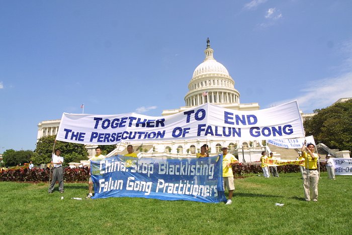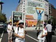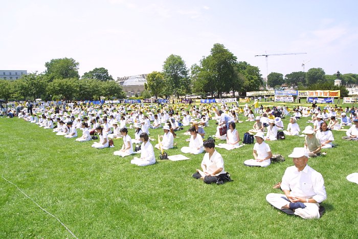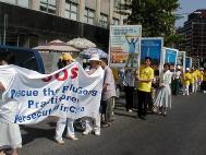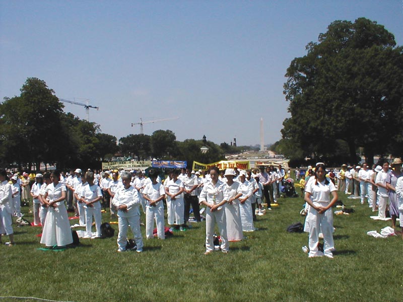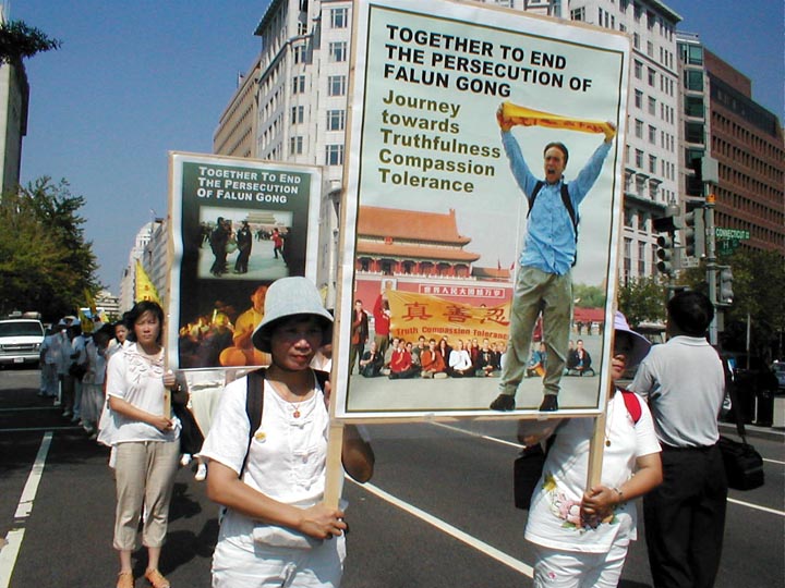 上午十时,法轮功学员列队游行,他们从中国大使馆出发,经康涅迪格大道,宾夕法尼亚大道和宪法大道,游行至国会山西草坪。他们举着写有“一起结束在中国大陆对法轮功的迫害”、“善良的人们请来了解法轮功的真相”、“法轮大法好”等横幅,并沿路播放法轮功的音乐“济世”。