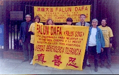2002年7.20三周年期间,部分西班牙法轮功学员在中国大使馆前炼功、发正念,呼吁国际社会制止中国江氏集团对法轮功的残酷迫害。