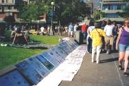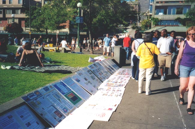 这里游人众多,包括大陆来的游客。一位大陆游客看了这20多张展板后,对一学员说,你们的组织真庞大。学员说,“我们没有组织,比如,这些展板全是我自己做的。我从网上下载照片,是自愿的,没有人叫我做;今天来这里也是我们自己想来的。”游客听完后,吃惊之余也显出对法轮功学员的敬佩。