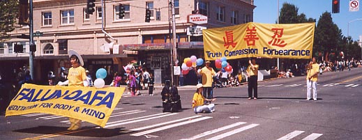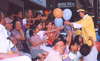 三次游行中我们举起了“法轮大法──性命双修功法”的英文横幅和十尺高的“真善忍”中英文大横幅。路旁的市民向我们挥手致意,为我们的功法表演而鼓掌。派资料的学员都忙不过来,尤其小朋友们伸上小手来索要气球,更令人应接不暇。每次游行当我们来到主席台前,一位学员就递上一份仅几句话的法轮大法的介绍。主席台主持向观众宣读,这样便把大法简明扼要地介绍给了观众。