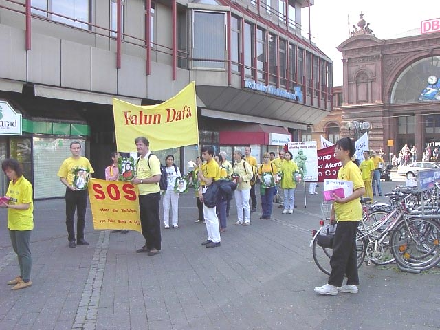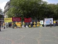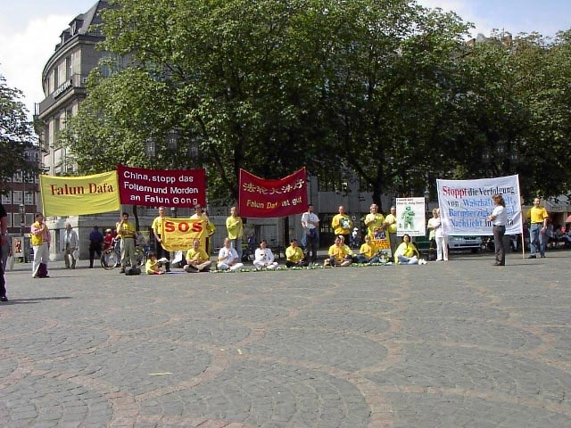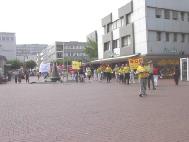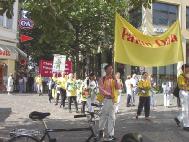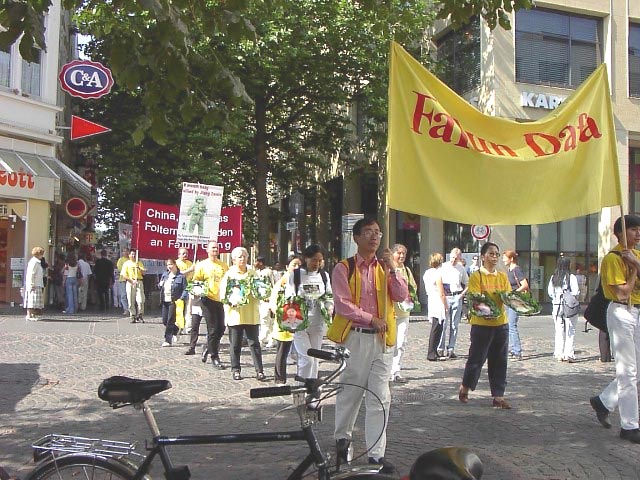 七月二十日上午,游行的队伍穿过了波恩市中心的步行街。在游行队伍默默地行进时,几千份传单发到了行人手中,从而使公众了解了法轮功,引起了人们对在中国受迫害的弟子们的关注。在昔日的首都,美丽的大学城,我们碰到的人大多对我们十分理解,很多人都知道法轮功:“噢,法轮功。”中午我们在市中心的Muenster广场集体发正念。