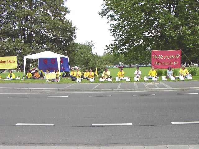 我们游行穿过一个美丽的公园后,在市政礼堂前开始折回,加入参加静坐的同修队伍中,有两位记者也去了那里。参加静坐的弟子们,在波恩市中心的游行开始时,向很多行人介绍我们的情况。一些看到我们游行的中国人,直接去找了在使馆前参加静坐的弟子们进一步了解情况。