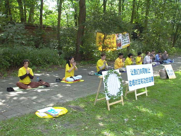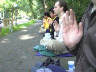 “让我们共同制止这场对法轮功的迫害”的中英文大字标语吸引着过往行人,很多人驻足观看并接受真相材料。在这庄严肃穆的气氛中,我们用纯净的正念在另外空间清除自己的业力与执著,以及一切迫害大法的邪恶因素。